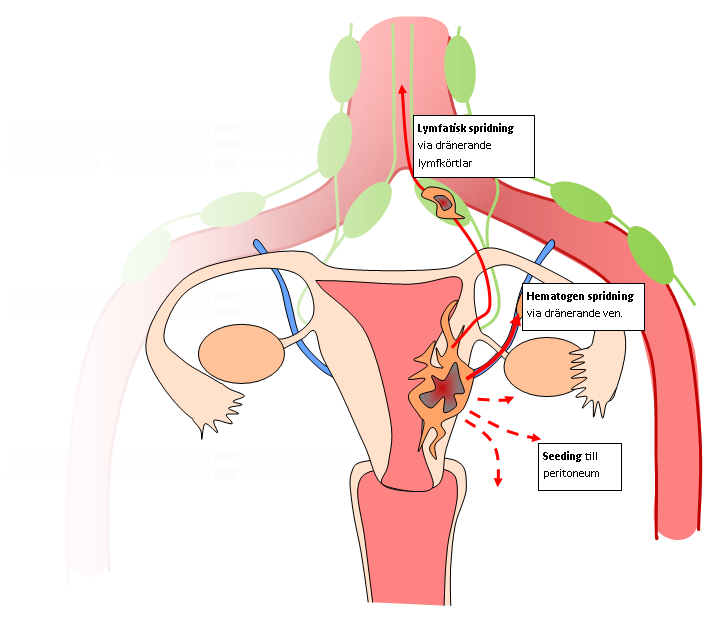 (som ovarierna står i direkt kontakt med). Dessa metastaser kan sitta på bukväggen utan att invadera till de underliggande organen, varför de är tecken på att förmågan att metastasera är skild från förmågan att invadera.