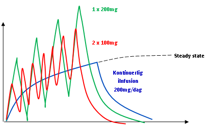 Ges läkemedlet i upprepade doser (2 tabletter/dag tex) kommer koncentrationen att variera över tid,