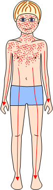 Småfläckigt, rödaktigt, ej sammanflytande. Från ansiktet sprider det sig ned över bål och extremiteter.