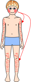Värst i armhålor, ljumskar och ansikte (nedre delen, uppklarning runt munnen). Bleknar vid tryck.