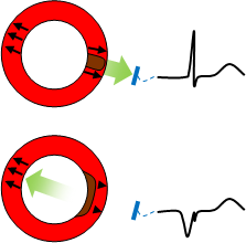 Transmural infarkt med liten yta ger ej Q-våg då elektroden registrerar viabelt myokard vid sidan av skadan