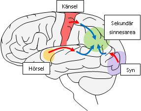Primära sinnesareor för sinnesintryck (i bilden syn, hörsel, känsel) ger sannolikt upphov till en grov återgivning av det som vi upplevt med våra sinnen.